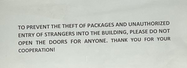 A sign posted at the entrance of Park Place Tower warns tenants not to open the front door to strangers in an effort to prevent package theft. But it’s the presence of a thief living inside the building that’s delivering concern among tenants.