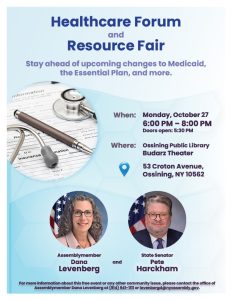 Assemblywoman Dana Levenberg and state Sen. Pete Harckham will be hosting a bilingual healthcare forum and resource fair at the Ossining Public Library on Monday, Oct. 27, from 6 to 8 p.m.